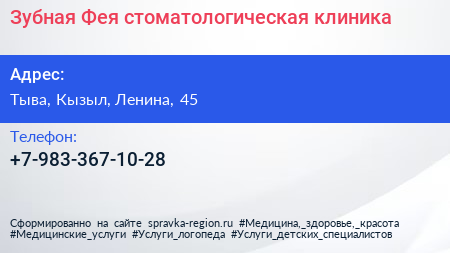 Зубная Фея, стоматологическая клиника по адресу Тыва, Кызыл, Ленина, 45 в дальнейшем Организация, размещена в следующих категориях: