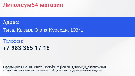 Линолеум54, магазин по адресу Тыва, Кызыл, Оюна Курседи, 103/1 в дальнейшем Организация, размещена в следующих категориях: