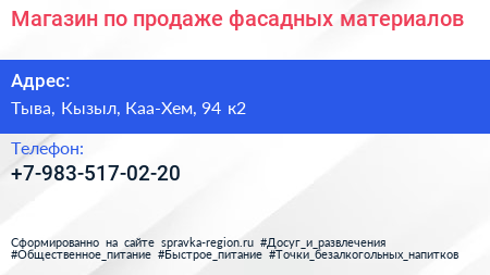 Магазин по продаже фасадных материалов по адресу Тыва, Кызыл, Каа-Хем, 94 к2 в дальнейшем Организация, размещена в следующих категориях: