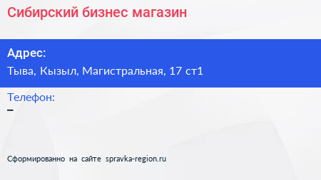 Сибирский бизнес, магазин по адресу Тыва, Кызыл, Магистральная, 17 ст1 в дальнейшем Организация, размещена в следующих категориях: