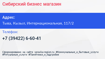 Сибирский бизнес, магазин по адресу Тыва, Кызыл, Интернациональная, 117/2 в дальнейшем Организация, размещена в следующих категориях: