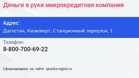Деньги в руки, микрокредитная компания по адресу Дагестан, Кизилюрт, Станционный переулок, 1 в дальнейшем Организация, размещена в следующих категориях: