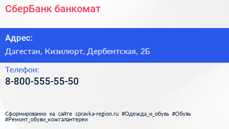 СберБанк, банкомат по адресу Дагестан, Кизилюрт, Дербентская, 2Б в дальнейшем Организация, размещена в следующих категориях: