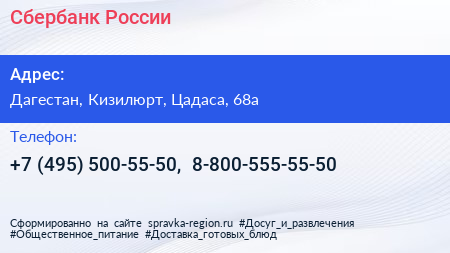 Сбербанк России по адресу Дагестан, Кизилюрт, Цадаса, 68а в дальнейшем Организация, размещена в следующих категориях: