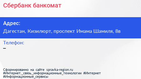Сбербанк, банкомат по адресу Дагестан, Кизилюрт, проспект Имама Шамиля, 8в в дальнейшем Организация, размещена в следующих категориях: