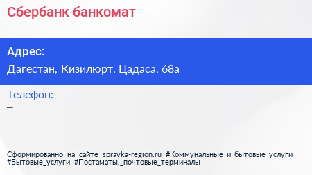 Сбербанк, банкомат по адресу Дагестан, Кизилюрт, Цадаса, 68а в дальнейшем Организация, размещена в следующих категориях: