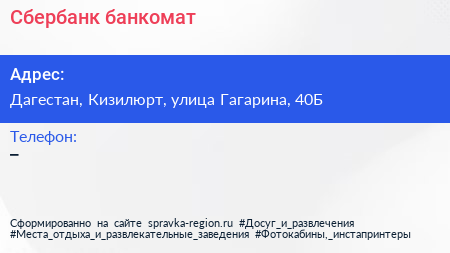 Сбербанк, банкомат по адресу Дагестан, Кизилюрт, улица Гагарина, 40Б в дальнейшем Организация, размещена в следующих категориях: