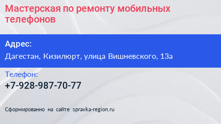 Мастерская по ремонту мобильных телефонов по адресу Дагестан, Кизилюрт, улица Вишневского, 13а в дальнейшем Организация, размещена в следующих категориях: