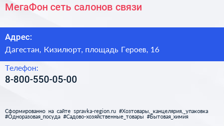 МегаФон, сеть салонов связи по адресу Дагестан, Кизилюрт, площадь Героев, 16 в дальнейшем Организация, размещена в следующих категориях: