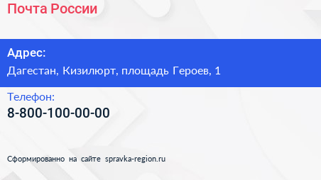 Почта России по адресу Дагестан, Кизилюрт, площадь Героев, 1 в дальнейшем Организация, размещена в следующих категориях: