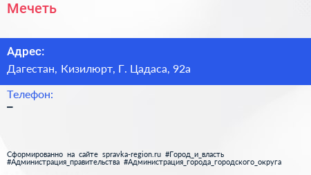 Мечеть по адресу Дагестан, Кизилюрт, Г. Цадаса, 92а в дальнейшем Организация, размещена в следующих категориях: