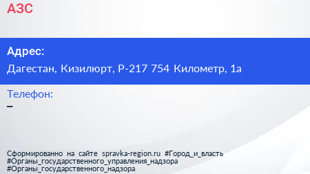 АЗС по адресу Дагестан, Кизилюрт, Р-217 754 Километр, 1а в дальнейшем Организация, размещена в следующих категориях: