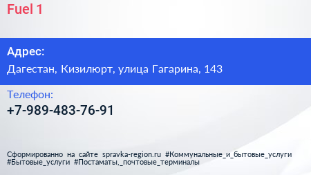Fuel 1 по адресу Дагестан, Кизилюрт, улица Гагарина, 143 в дальнейшем Организация, размещена в следующих категориях: