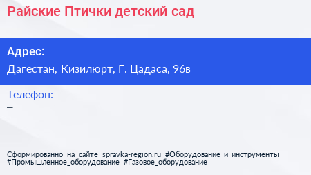 Райские Птички, детский сад по адресу Дагестан, Кизилюрт, Г. Цадаса, 96в в дальнейшем Организация, размещена в следующих категориях: