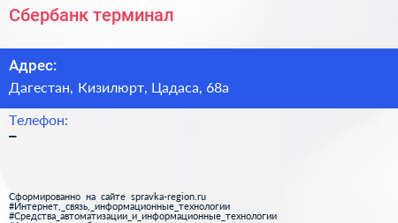 Сбербанк, терминал по адресу Дагестан, Кизилюрт, Цадаса, 68а в дальнейшем Организация, размещена в следующих категориях: