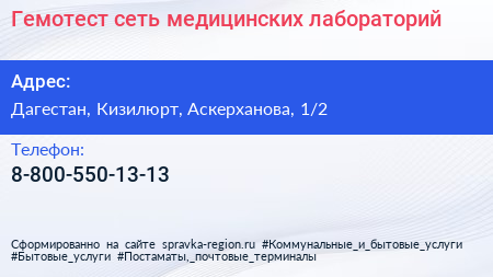 Гемотест, сеть медицинских лабораторий по адресу Дагестан, Кизилюрт, Аскерханова, 1/2 в дальнейшем Организация, размещена в следующих категориях:
