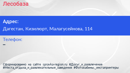 Лесобаза по адресу Дагестан, Кизилюрт, Малагусейнова, 114 в дальнейшем Организация, размещена в следующих категориях: