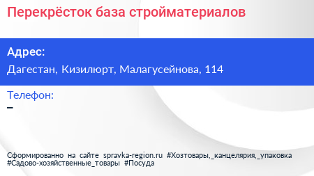 Перекрёсток, база стройматериалов по адресу Дагестан, Кизилюрт, Малагусейнова, 114 в дальнейшем Организация, размещена в следующих категориях: