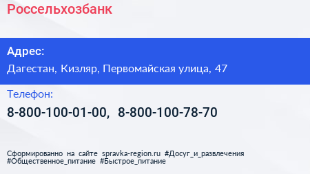 Россельхозбанк по адресу Дагестан, Кизляр, Первомайская улица, 47 в дальнейшем Организация, размещена в следующих категориях:
