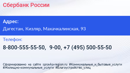 Сбербанк России по адресу Дагестан, Кизляр, Махачкалинская, 93 в дальнейшем Организация, размещена в следующих категориях: