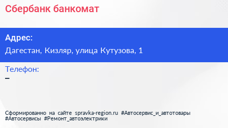 Сбербанк, банкомат по адресу Дагестан, Кизляр, улица Кутузова, 1 в дальнейшем Организация, размещена в следующих категориях: