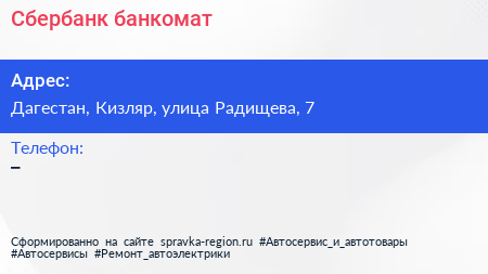 Сбербанк, банкомат по адресу Дагестан, Кизляр, улица Радищева, 7 в дальнейшем Организация, размещена в следующих категориях: