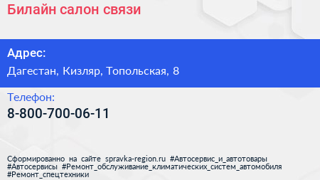 Билайн, салон связи по адресу Дагестан, Кизляр, Топольская, 8 в дальнейшем Организация, размещена в следующих категориях: