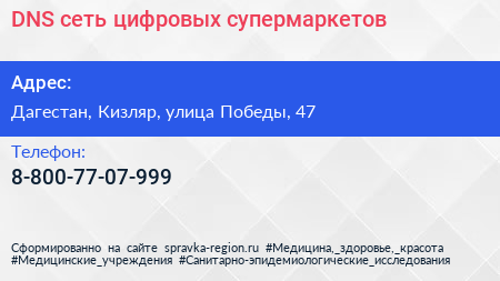 DNS, сеть цифровых супермаркетов по адресу Дагестан, Кизляр, улица Победы, 47 в дальнейшем Организация, размещена в следующих категориях: