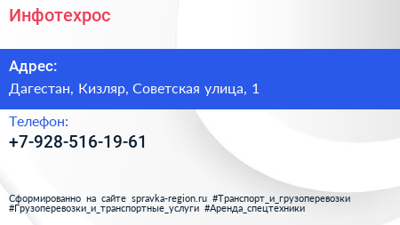 Инфотехрос по адресу Дагестан, Кизляр, Советская улица, 1 в дальнейшем Организация, размещена в следующих категориях:
