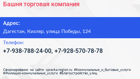 Башня, торговая компания по адресу Дагестан, Кизляр, улица Победы, 124 в дальнейшем Организация, размещена в следующих категориях: