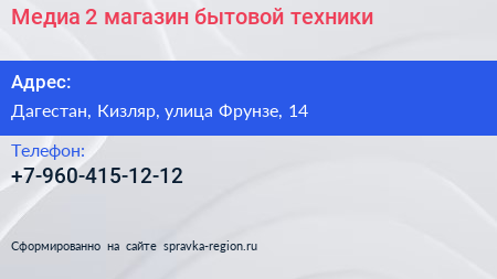Медиа 2, магазин бытовой техники по адресу Дагестан, Кизляр, улица Фрунзе, 14 в дальнейшем Организация, размещена в следующих категориях: