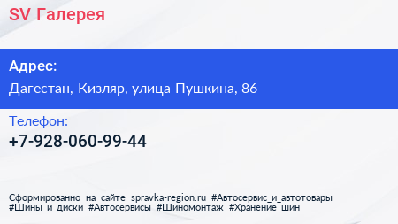 SV Галерея по адресу Дагестан, Кизляр, улица Пушкина, 86 в дальнейшем Организация, размещена в следующих категориях: