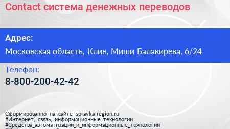 Contact, система денежных переводов по адресу Московская область, Клин, Миши Балакирева, 6/24 в дальнейшем Организация, размещена в следующих категориях: