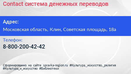 Contact, система денежных переводов по адресу Московская область, Клин, Советская площадь, 18а в дальнейшем Организация, размещена в следующих категориях:
