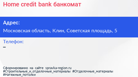 Home credit bank, банкомат по адресу Московская область, Клин, Советская площадь, 5 в дальнейшем Организация, размещена в следующих категориях: