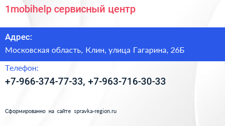 1mobihelp, сервисный центр по адресу Московская область, Клин, улица Гагарина, 26Б в дальнейшем Организация, размещена в следующих категориях: