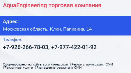 AquaEngineering, торговая компания по адресу Московская область, Клин, Папивина, 14 в дальнейшем Организация, размещена в следующих категориях: