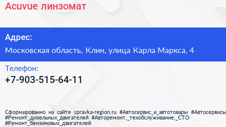 Acuvue, линзомат по адресу Московская область, Клин, улица Карла Маркса, 4 в дальнейшем Организация, размещена в следующих категориях: