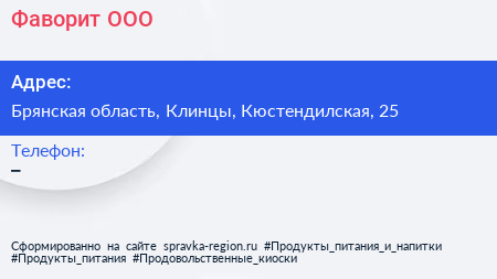 Фаворит, ООО по адресу Брянская область, Клинцы, Кюстендилская, 25 в дальнейшем Организация, размещена в следующих категориях: