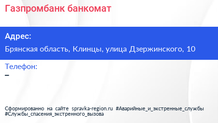 Газпромбанк, банкомат по адресу Брянская область, Клинцы, улица Дзержинского, 10 в дальнейшем Организация, размещена в следующих категориях: