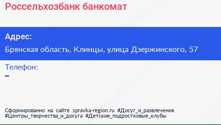 Россельхозбанк, банкомат по адресу Брянская область, Клинцы, улица Дзержинского, 57 в дальнейшем Организация, размещена в следующих категориях: