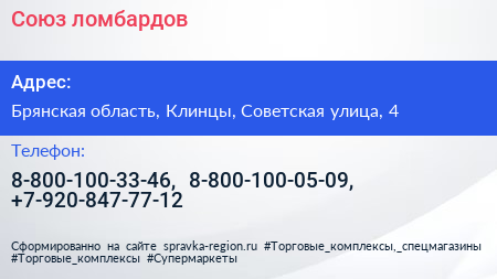 Союз ломбардов по адресу Брянская область, Клинцы, Советская улица, 4 в дальнейшем Организация, размещена в следующих категориях: