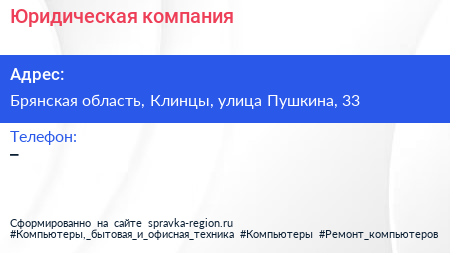 Юридическая компания по адресу Брянская область, Клинцы, улица Пушкина, 33 в дальнейшем Организация, размещена в следующих категориях: