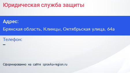 Юридическая служба защиты по адресу Брянская область, Клинцы, Октябрьская улица, 64а в дальнейшем Организация, размещена в следующих категориях:
