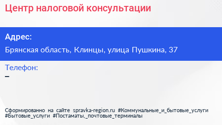 Центр налоговой консультации по адресу Брянская область, Клинцы, улица Пушкина, 37 в дальнейшем Организация, размещена в следующих категориях: