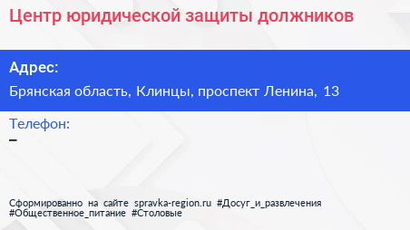 Центр юридической защиты должников по адресу Брянская область, Клинцы, проспект Ленина, 13 в дальнейшем Организация, размещена в следующих категориях:
