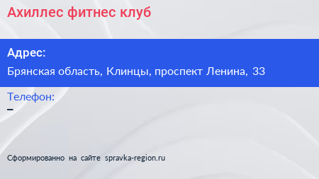 Ахиллес, фитнес-клуб по адресу Брянская область, Клинцы, проспект Ленина, 33 в дальнейшем Организация, размещена в следующих категориях: