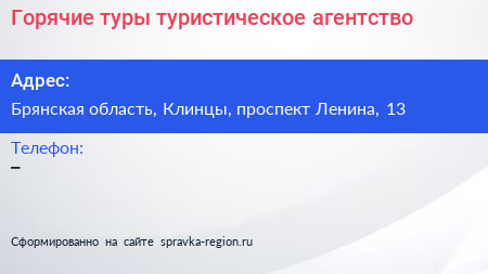 Горячие туры, туристическое агентство по адресу Брянская область, Клинцы, проспект Ленина, 13 в дальнейшем Организация, размещена в следующих категориях: