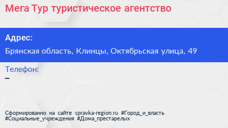 Мега-Тур, туристическое агентство по адресу Брянская область, Клинцы, Октябрьская улица, 49 в дальнейшем Организация, размещена в следующих категориях: