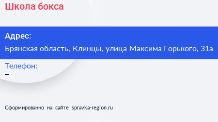 Школа бокса по адресу Брянская область, Клинцы, улица Максима Горького, 31а в дальнейшем Организация, размещена в следующих категориях: